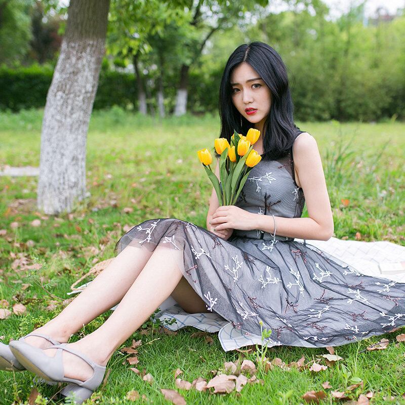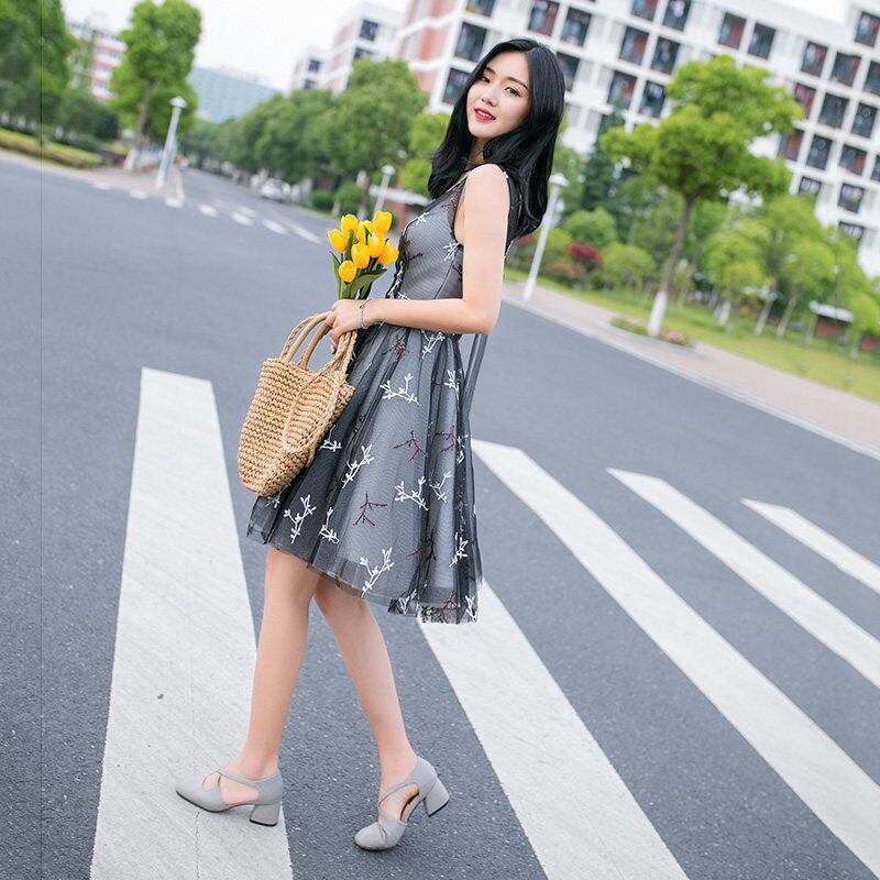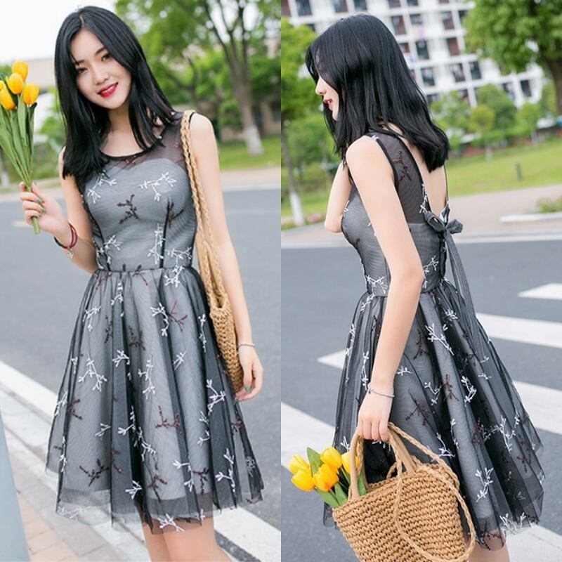 オシャレ ノースリーブ黒パーティードレス 結婚式 膝丈 二次会