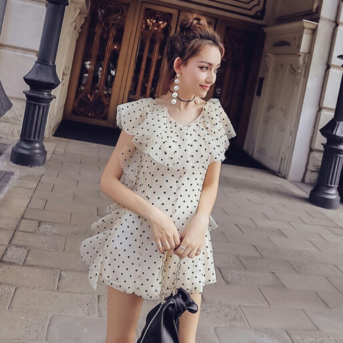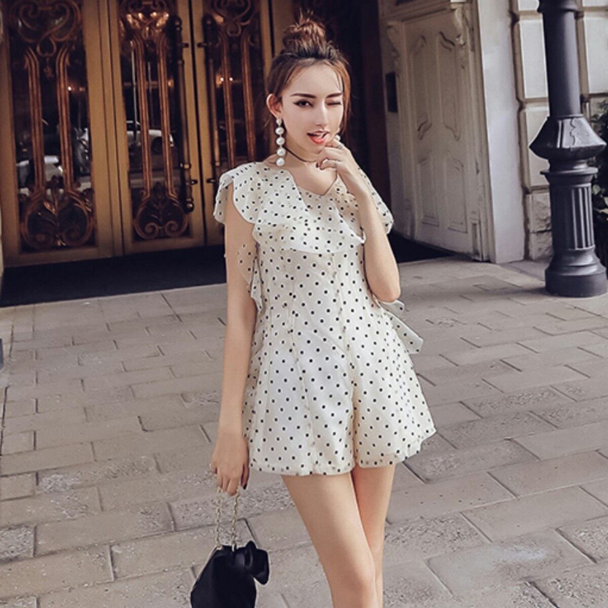 フリルとドレープそしてドット模様とガーリーな魅力が詰まったオールインワンでございますので、引き締め役として大ぶりのアクセサリーはいかがでしょうか